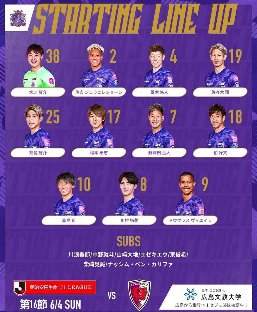 日职联首发:广岛维埃拉先发 京都无外援出战