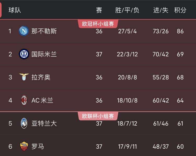意甲前四仅剩一席 米兰战平尤文即可锁定欧冠资格