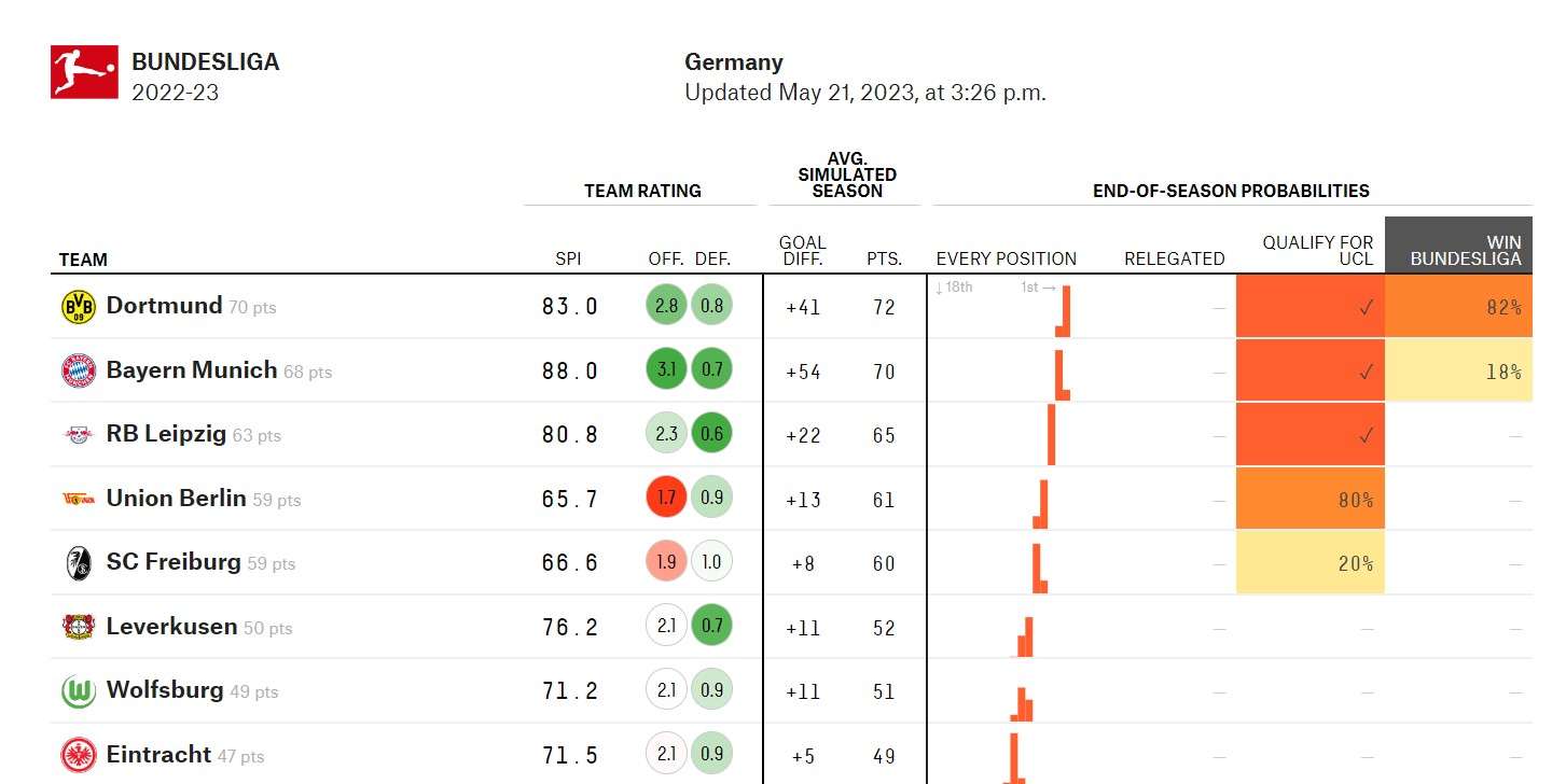 德甲争冠最新形势:多特最后一轮赢球即可捧杯 拜仁夺冠概率只剩18