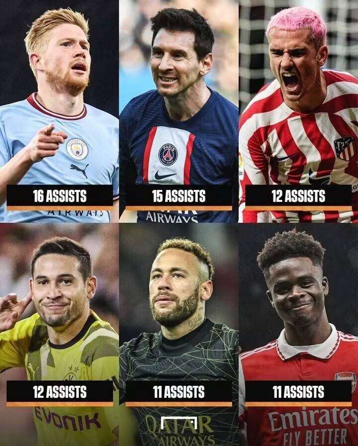 助攻王之争白热化!德布劳内仅领先梅西1次 格子虎视眈眈