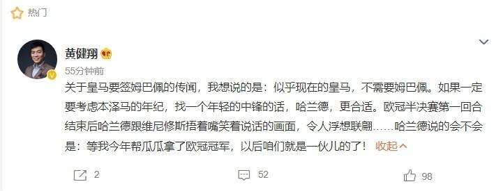 黄健翔:现在皇马不需要姆巴佩 哈兰德更合适