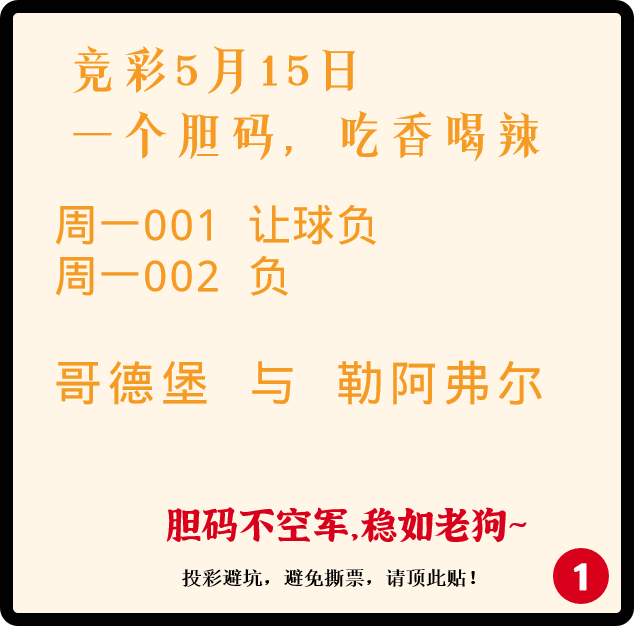 竞彩5月15日 一个胆码,吃香喝辣
