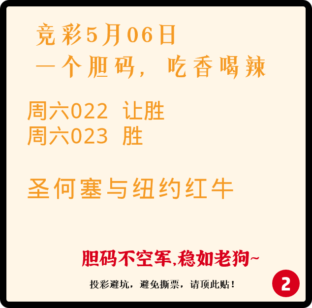 竞彩5月06日 一个胆码,吃香喝辣