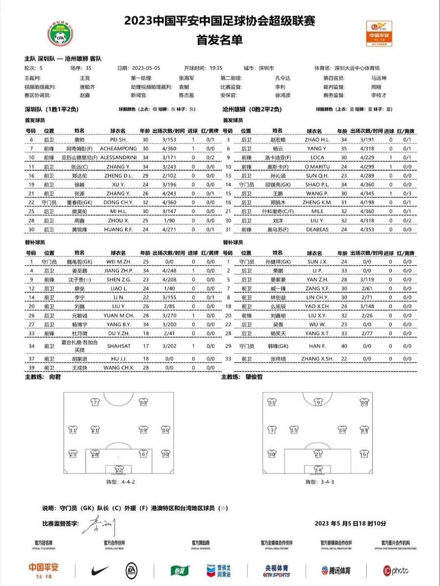 深圳队vs沧州雄狮首发:阿奇姆彭PK奥斯卡 奥乌苏、什科里奇在列