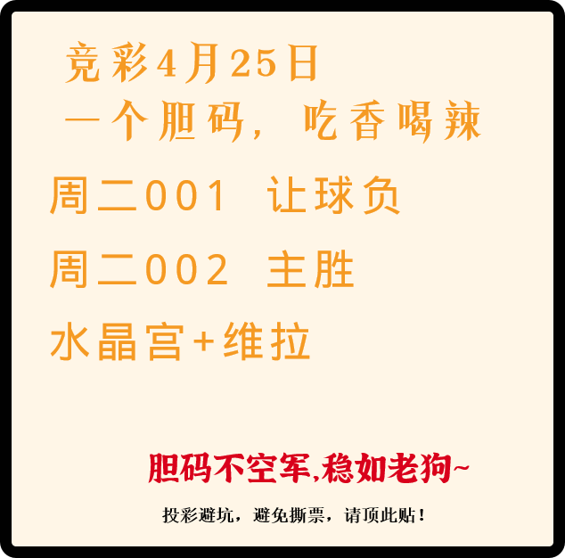 竞彩4月25日 一个胆码,吃香喝辣