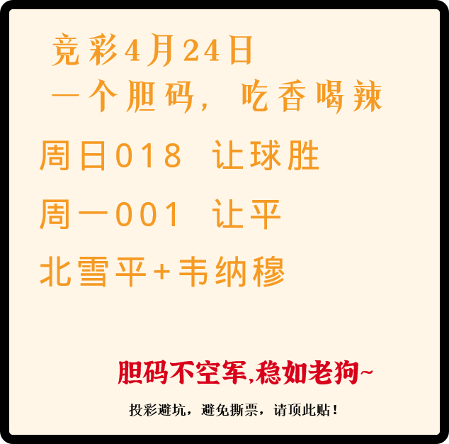 竞彩4月24日 一个胆码,吃香喝辣