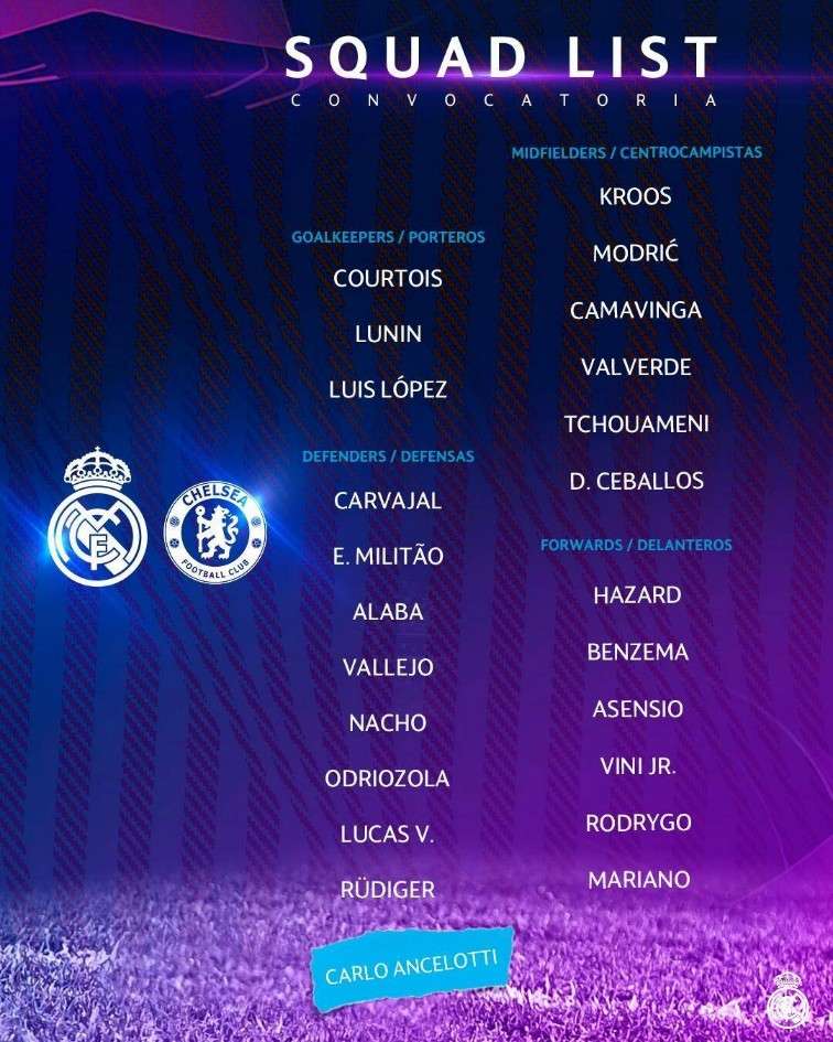 皇马VS切尔西大名单出炉:本泽马领衔 阿扎尔、维尼修斯在列