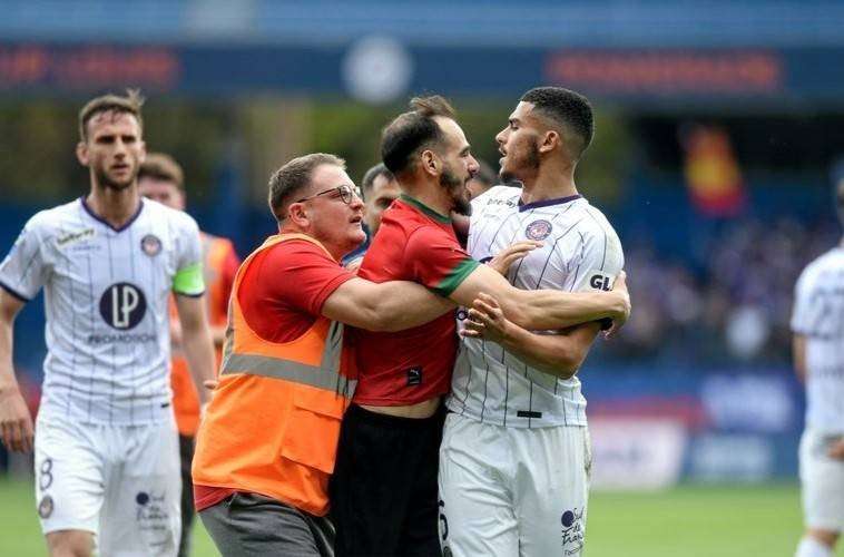 蒙彼利埃球迷冲入场内袭击图卢兹助教+拥抱球员 比赛两度暂停