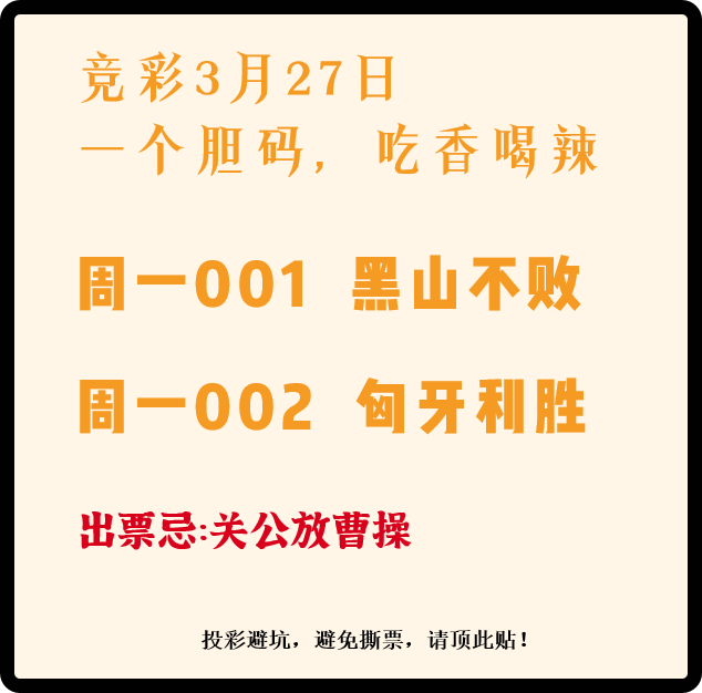 竞彩3月27日 一个胆码,吃香喝辣