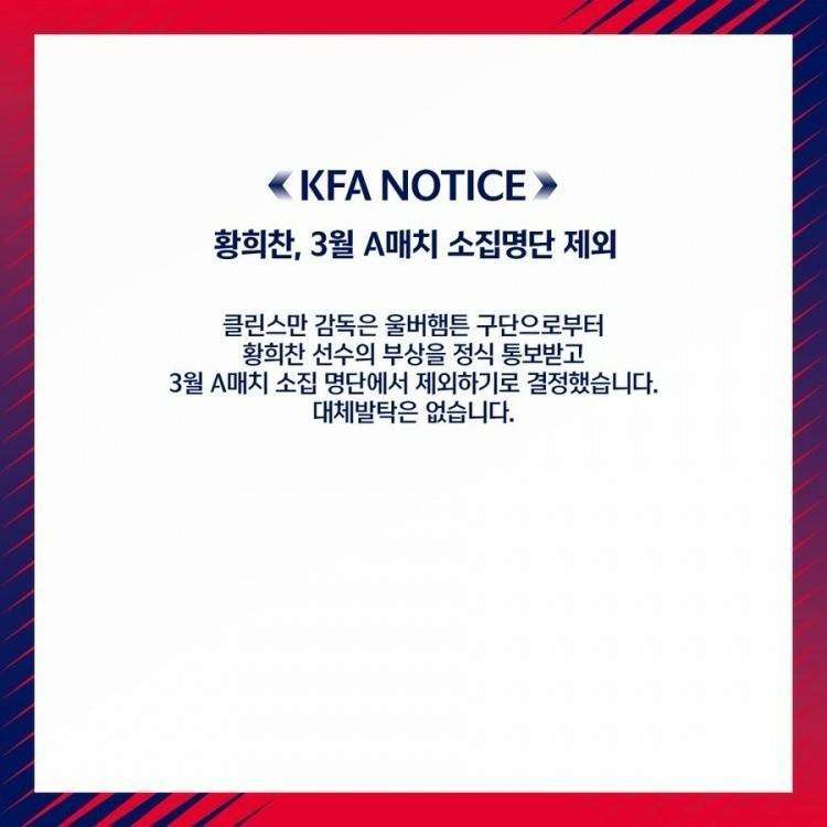 韩足协官方:黄喜灿因伤退出韩国队大名单 未有球员递补