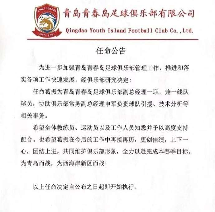 官方:青岛西海岸球员葛振兼任俱乐部副总